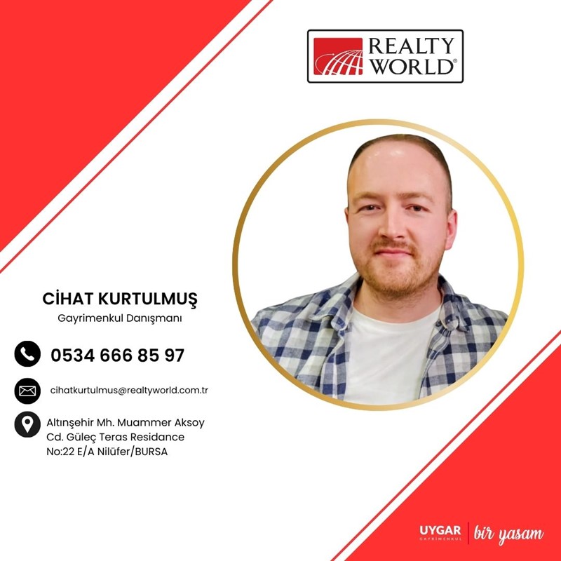 +90 534 666 85 97 cihatkurtulmus@realtyworld.com.tr +90 224 413 01 23 Altınşehir Mah. Muammer Aksoy Cad. Güleç Teras Rezidans No 2 E / A Nilüfer / BURSA